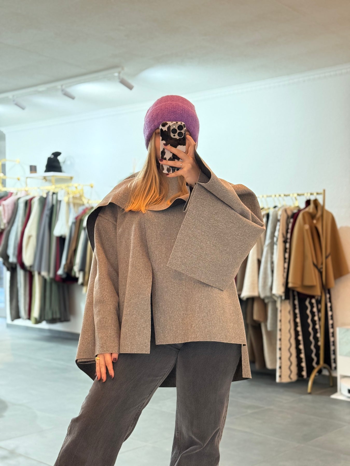 Wunderschönes Cape, übergroßer, asymmetrischer Schnitt, breiter Kragen im drapierten Schal-Stil, Fledermausärmel, Material: 96% Polyester, 4% Elasthan, Made in Italy 🇮🇹, das Model ist 1,65 cm groß