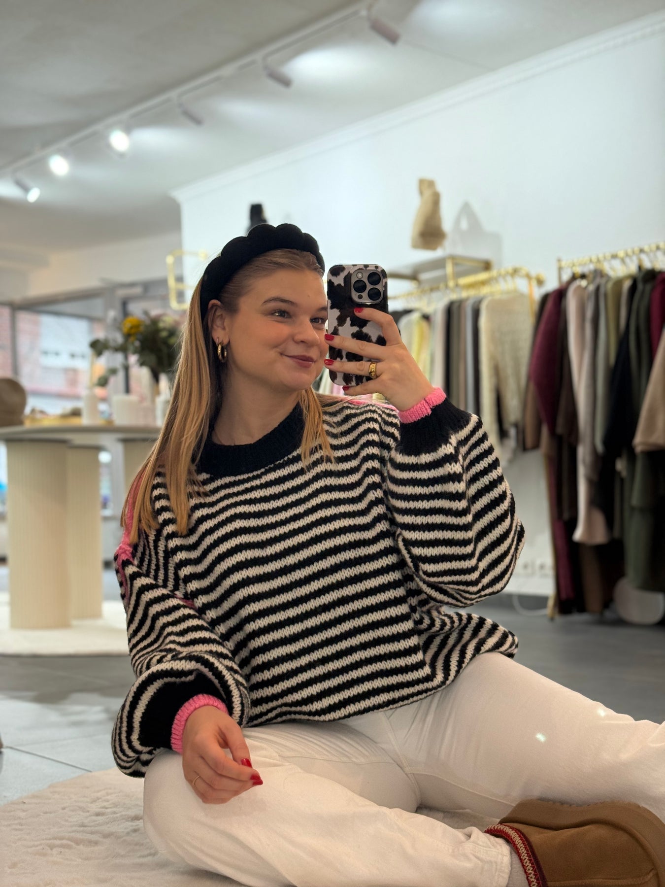 Oversize Pullover mit Streifen, Material: 38 % Wolle, 36 %Acryl, 18 % Polyester, 8 % PBT, das Model ist 1,60 cm groß