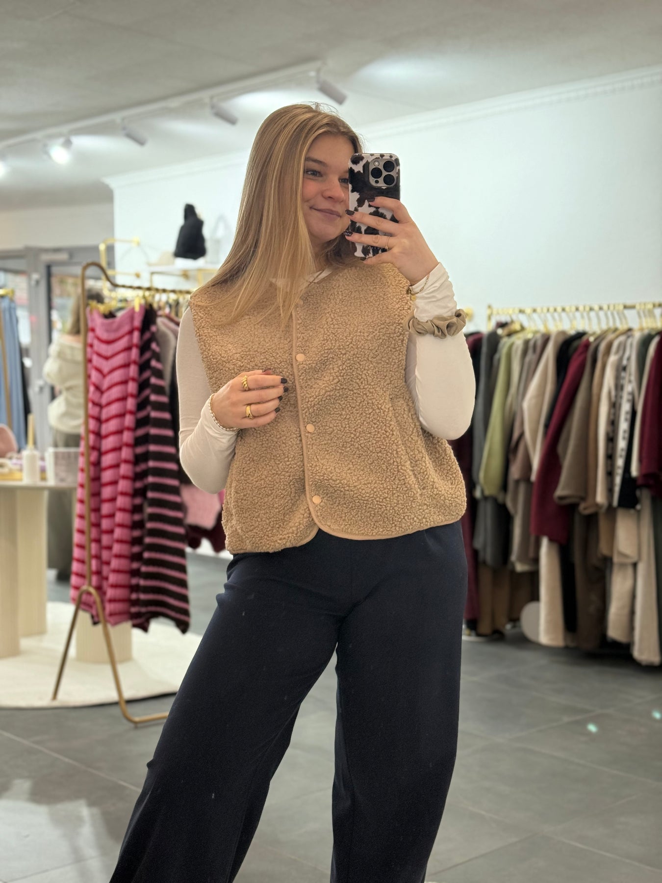 Kuschelige Weste in Teddyoptik, Material: 100% Polyester, das Model ist 1,60 groß, Onesize