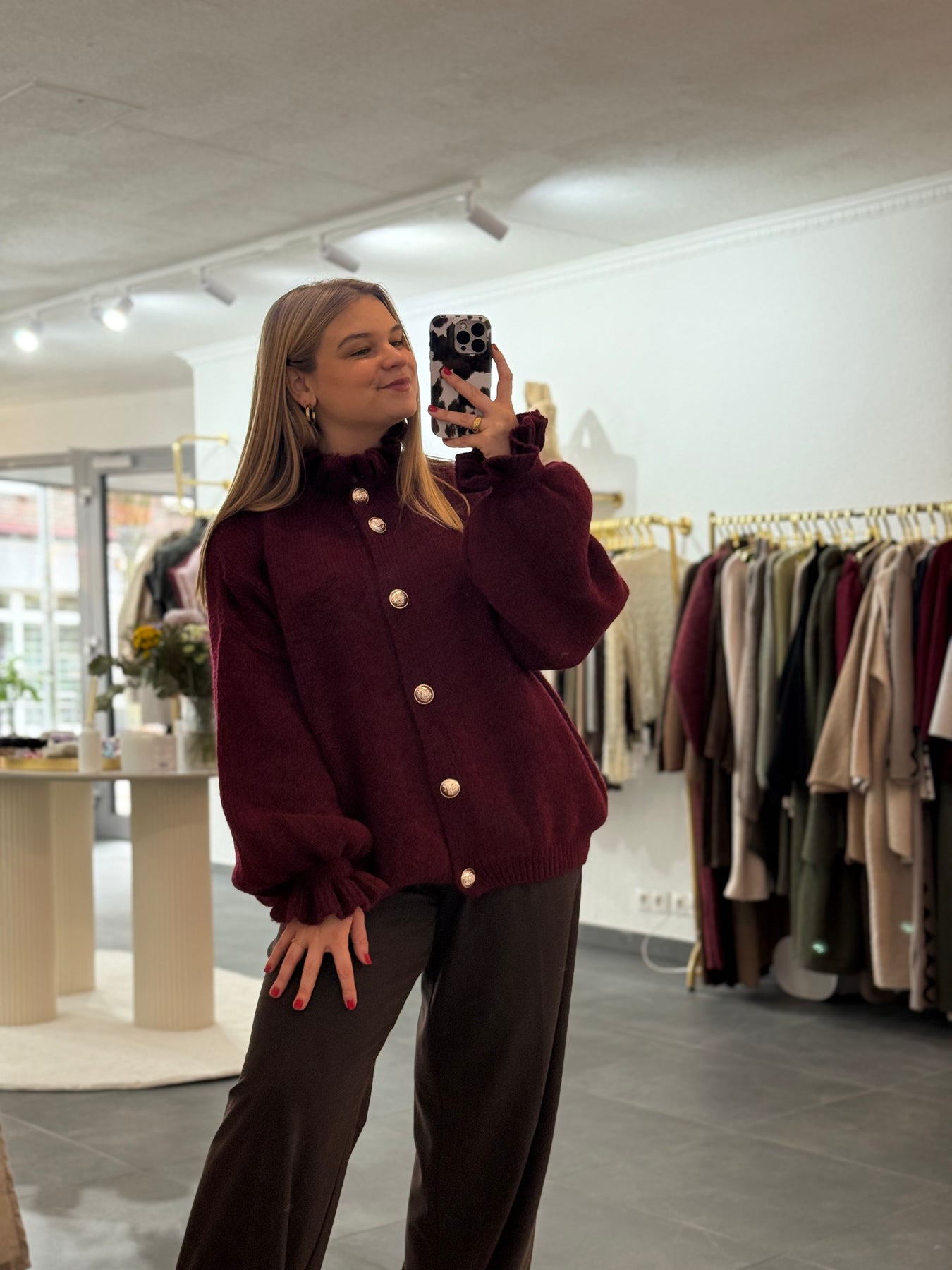 Oversize Cardigan mit goldenen Knöpfen und Rüschen, weicher Stoff (kein Kratzen), Material: 38% Wolle, 36% Acryl, 18 % Polyester, 8% PBT, das Model ist 1,60 cm groß