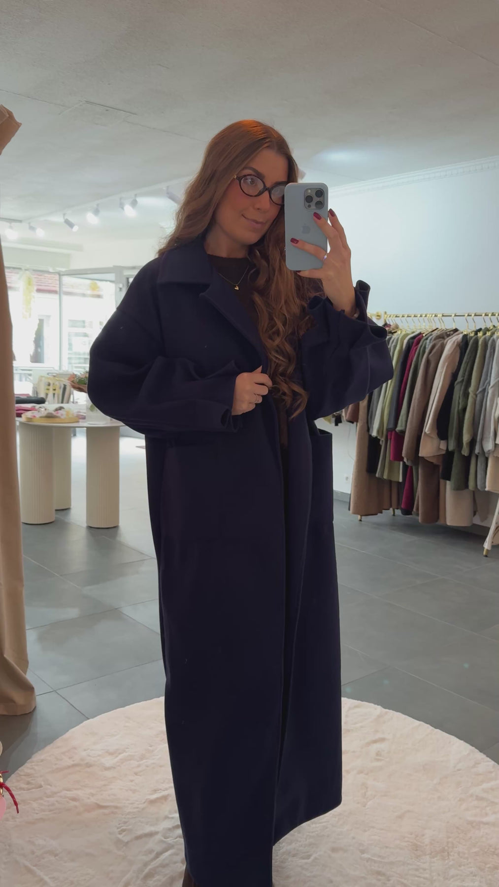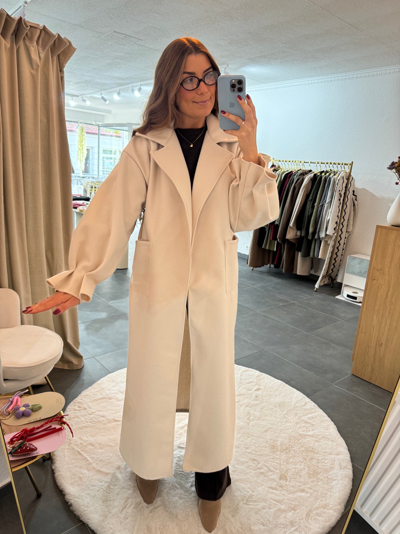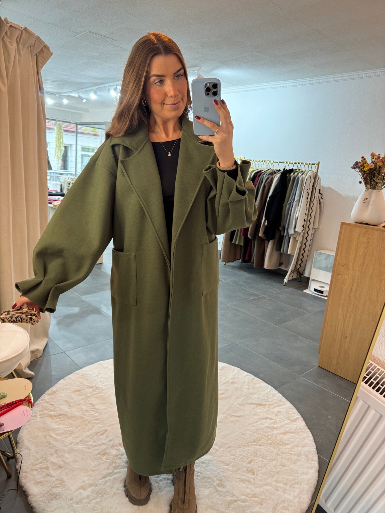 Traumhafter, langer Mantel, mit Raffungen am Ärmel, Material: 100% Polyester, das Model ist 1,75 cm groß, Made in Italy 🇮🇹
