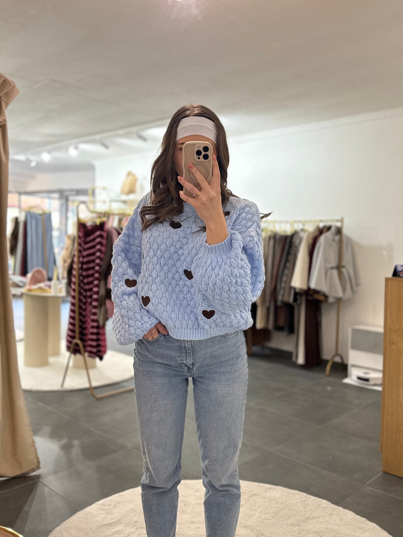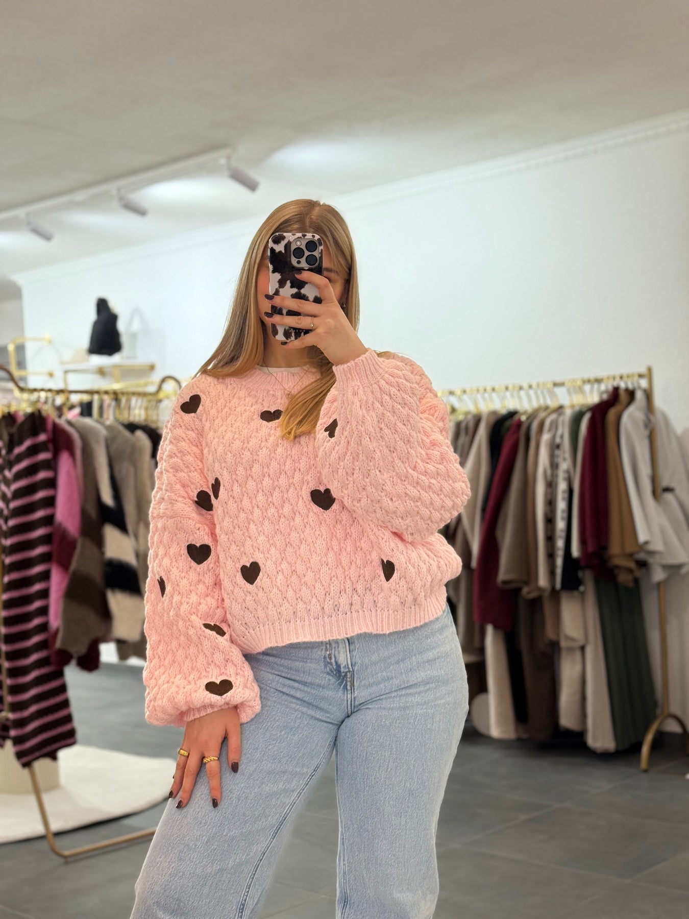 Wunderschöner Pullover mit gestickten Herzen in Braun. Ballonärmeln und Oversize Fit. Dicker Stoff. Kein Kratzen. Material: 50% Viscose, 50% Polyamid. Onsize (XS-XL)